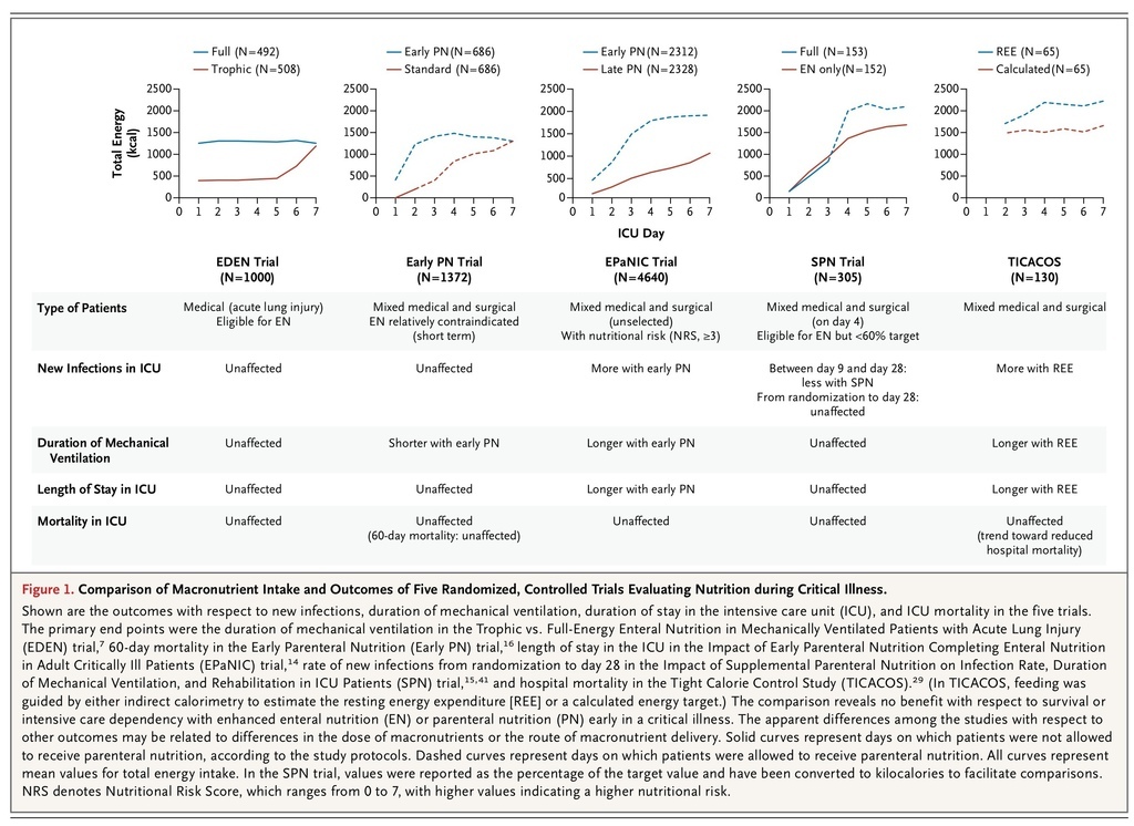 Comparison of Macronutrient Intake and Outcomes of Five Randomized, Controlled Trials Evaluating Nutrition during Critical Illness.