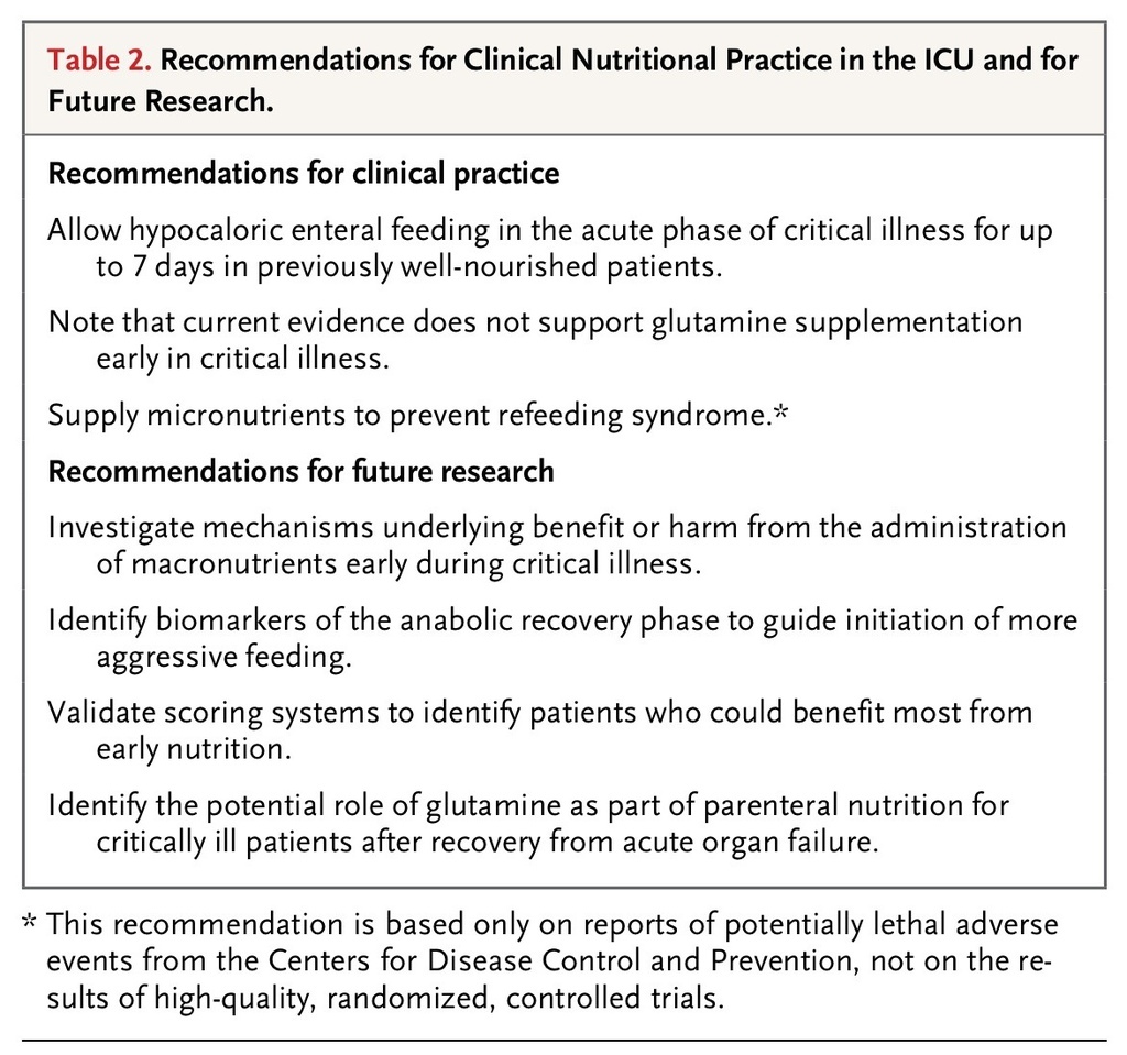 Recommendations for Clinical Nutritional Practice in the ICU and for Future Research.