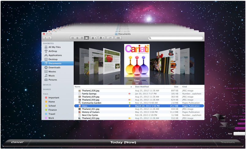 Time Machine 有別於其他備份應用程式,它不僅備份每個檔案,而且記住你系統在任一指定日的內容,因此你可以重新回到你 Mac 過去的狀態,或將你所製作文件復原為的之前的較舊版本。